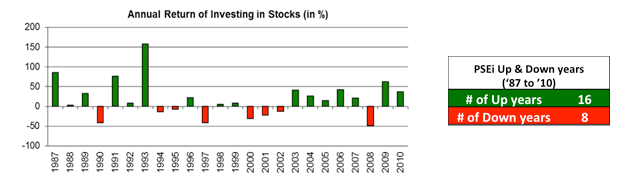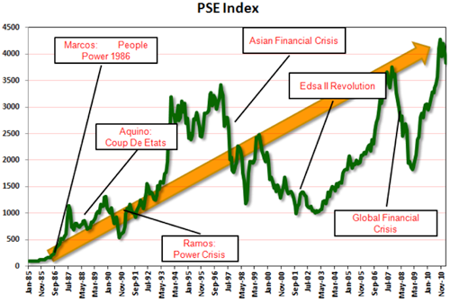 Long term investing solves the problem of short-term volatility (choppiness in price). On occasion some issues may come up that may cause prices to swing up and down whether economic, political or natural events. But you can see from the chart below that the PSE index always bounces back to new highs even through problematic times.
